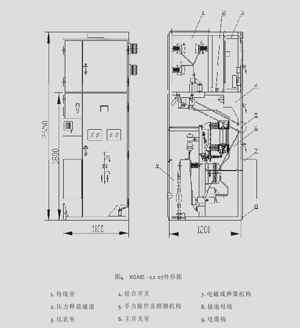 3. 電纜室在柜體下部的后方,電纜室內(nèi)支持絕緣子可設(shè)有電壓監(jiān)視裝置,電纜固定在支架上,對于主結(jié)線為聯(lián)絡(luò)方案時(shí),本室則為聯(lián)絡(luò)電纜室。繼電器室在柜體上部前方,門上可安裝指示儀表、信號(hào)元件等二次元件,頂部還可布置二次小母線。